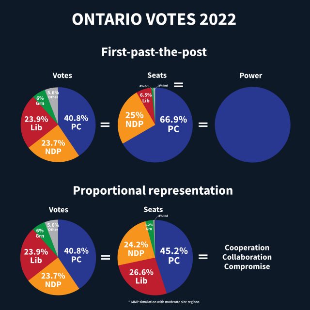 In the June 2022 Ontario election, Doug Ford’s PCs received 40.8% of the popular vote. First-past-the-post handed them 67% of the seats, and 100% of the power.