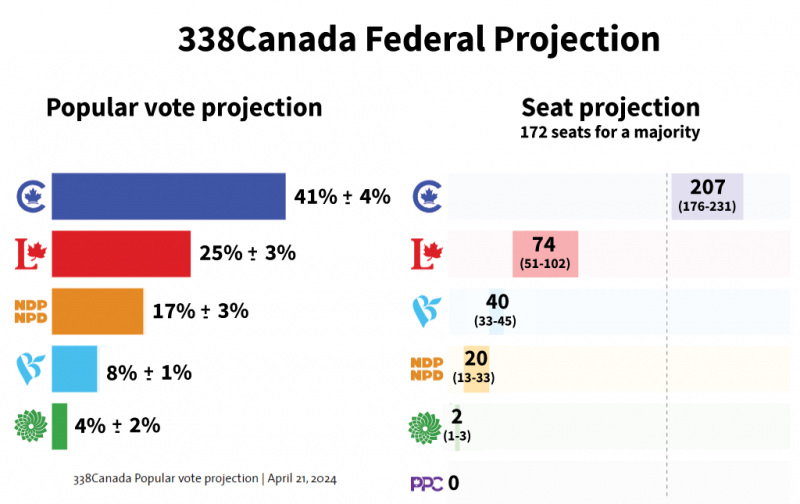 Projections show the Conservatives on track to win a crushing “majority” government with just 40% of the popular vote, thanks to the seat bonus provided by first-past-the-post.