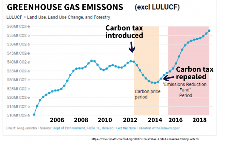 In the end, the carbon tax that had been brought in by the Labor government alone—resulting in the biggest annual reduction in greenhouse gas emissions in 24 years—was quickly reversed by the Liberal-National (conservative) government.