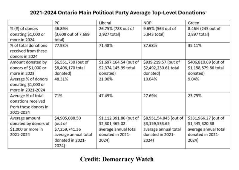 Data compiled by Democracy Watch in 2024 showed that the PCs had almost twice the percentage of donors who gave $1000 or more compared to the Liberals, and about five times the percentage of wealthy donors compared to the NDP and Greens.