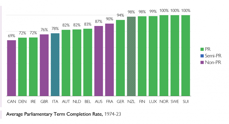 The introduction of a proportional system does away with this amplification of small changes in voter preferences, leading to a greater level of political stability, less partisanship, a longer-term perspective and increased policy coherence over time.