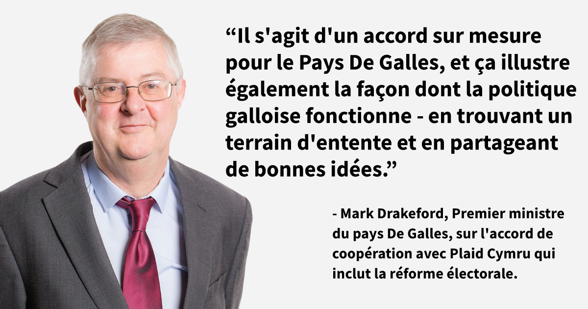 Le parti travailliste gallois et le parti Plaid Cymru viennent de signer un accord de coopération de trois ans qui comprend un engagement en faveur de la réforme électorale :