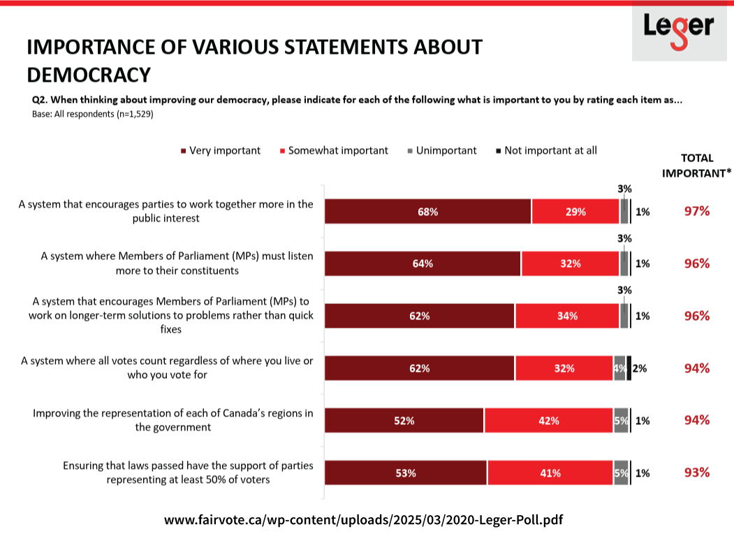 Les Canadiennes et les Canadiens veulent un système démocratique équitable, inclusif et coopératif. Un sondage national réalisé en 2025 a montré que 68 % des Canadiennes et des Canadiens sont favorables à la représentation proportionnelle et que seulement 19 % y sont opposés.