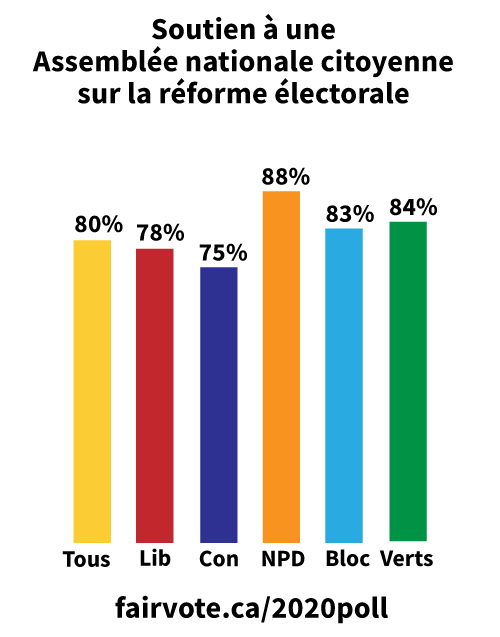 Selon un sondage national réalisé par Léger en 2020, 80 % des Canadiennes et des Canadiens – électeurs de tous les partis – sont en faveur d’une Assemblée nationale citoyenne sur la réforme électorale.