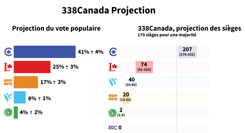 Les projections montrent que les conservateurs sont en voie de remporter un gouvernement « majoritaire » écrasant avec seulement 40 % du vote populaire, grâce à la prime de sièges fournie par le scrutin majoritaire uninominal à un tour.