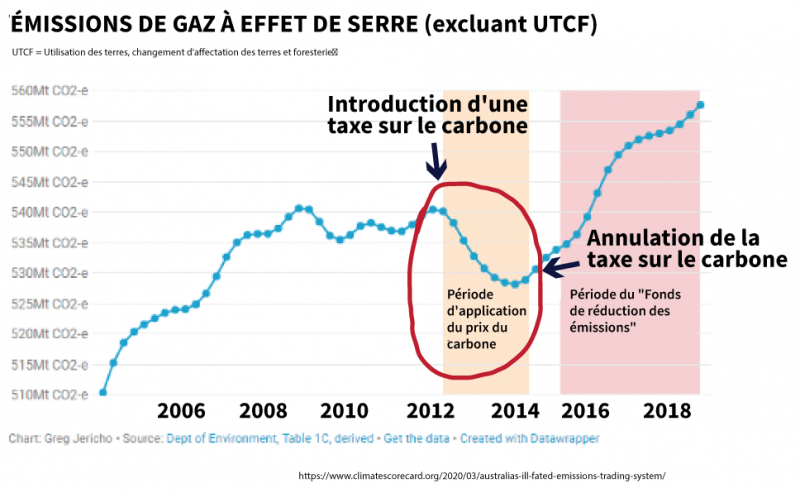 En fin de compte, la taxe sur le carbone qui avait été introduite par le seul gouvernement travailliste – entraînant la plus forte réduction annuelle des émissions de gaz à effet de serre depuis 24 ans – a été rapidement annulée par le gouvernement libéral-national (conservateur).