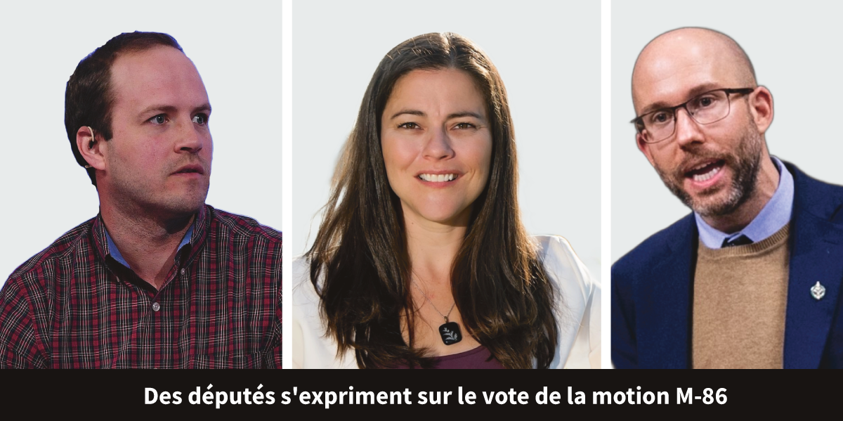 Il convient toutefois de noter que 39 députés libéraux ont voté en faveur de la motion M-86, et que ce nombre aurait été nettement plus élevé si le gouvernement n’avait pas pris position sur la motion et avait encouragé un vote libre à la place. Trois députés conservateurs ont même voté en sa faveur !