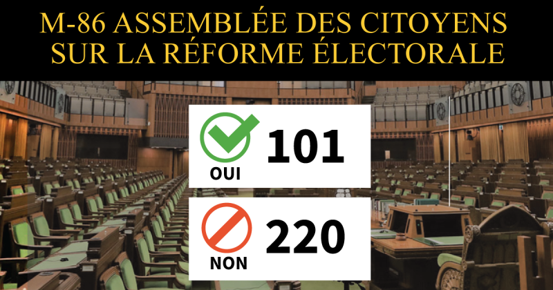Le 7 février, 39 députés libéraux et 3 députés conservateurs ont voté contre la position de leur parti, se joignant au NPD, aux Verts et au Bloc pour voter en faveur de la motion M-86 pour une Assemblée nationale citoyenne sur la réforme électorale.