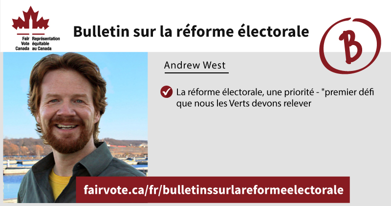 Extrait du débat parrainé par Représentation équitable au Canada : « Justin Trudeau a promis une réforme électorale plus de 1800 fois. Quelle preuve supplémentaire nous faut-il pour démontrer que les libéraux ne mettront jamais en œuvre une réforme électorale à moins d’y être contraints. À la lumière de cette réalité, j’ai une approche différente. Dans l’ère actuelle comportant cinq partis, j’estime qu’il faut environ 35 sièges pour influencer la formation d’un gouvernement. Nous pouvons gagner au moins 35 sièges, mais seulement si nous réunissons des millions d’électeurs progressistes sous l’égide de notre parti, ce qui nous donnera l’influence dont nous avons besoin. Dans ces conditions, nous serions en mesure d’imposer l’adoption d’un système électoral démocratique. Mais pour ce faire, nous allons devoir proposer une plate-forme audacieusement progressiste… »