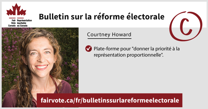 La plate-forme complète de Courtney comporte une seule ligne sur la réforme électorale : « Donner la priorité à la réforme électorale ». Il ne fait aucun doute qu’elle est partisane de la RP, mais elle ne donne aucun détail sur le degré de priorité qu’elle accorderait à la RP en situation minoritaire ou sur les mesures à prendre pour y parvenir. Comme elle dit dans la vidéo de sa plate-forme, « Power up New Leaders« : « Nous devons donner la priorité à la représentation proportionnelle. En ayant une diversité de voix autour de la table, nous aurons de meilleures idées et moins d’angles morts ».