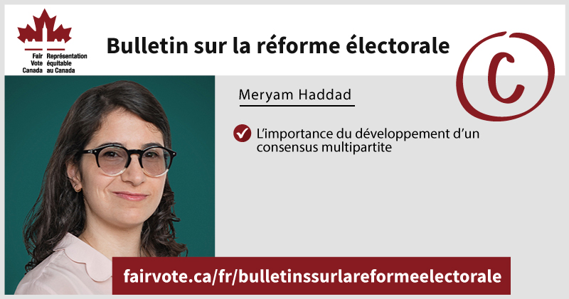 Il n’y a rien sur le site web de Meryam concernant la représentation proportionnelle. Comme nous, Meryam reconnaît que le soutien de plusieurs partis est une condition préalable au succès. Meryam semble soutenir un référendum, en dépit du point de vue répandu des experts et de l’expérience vécue qui suggèrent que les référendums sont un mauvais véhicule pour la délibération citoyenne et la prise de décision éclairée.