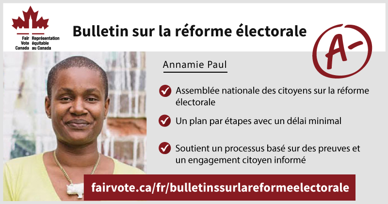 Annamie a établi un plan par étapes qui commence par une assemblée citoyenne nationale sur la réforme électorale — un processus de première classe fondé sur des preuves, l’engagement des citoyens et la prise de décision par ces derniers. On peut se demander si sa proposition de quatre thèmes à examiner par une telle assemblée selon Annamie ne la rendrait pas inutilement longue et ne risquerait pas d’entraver la mise en place d’un nouveau système électoral à temps pour les prochaines élections. On ne sait pas non plus quelle priorité Annamie accorde à la négociation d’un processus d’assemblée citoyenne dans l’éventualité d’un gouvernement minoritaire.