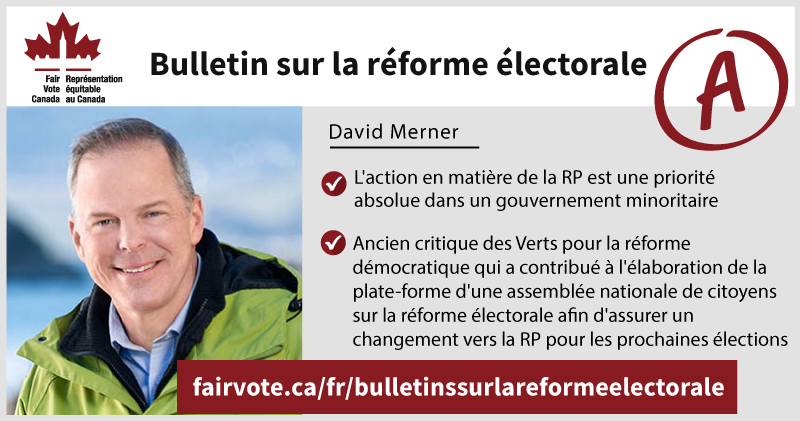 David note également que lors de ses tournées d’écoute : « J’ai entendu beaucoup de soutien à l’idée que, dans une situation de gouvernement minoritaire où les verts détiennent la balance du pouvoir, nous devons nous assurer que la législation de la RP est un élément essentiel de tout accord de coopération. À maintes reprises, j’ai entendu dire que la représentation proportionnelle doit être mise en œuvre sans délai et que notre position de négociation pour apporter notre soutien à un gouvernement minoritaire devrait être que (1) le gouvernement passe directement à la législation sans délai et que (2) la commission législative responsable de la Chambre des communes devrait mener une consultation exhaustive des experts à travers le pays avec et de Canadiens.nes qui reflètent toute la diversité de notre pays ».