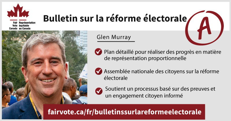Glen a une position et un plan détaillés et réfléchis sur son site web. Glen est favorable à la mise en œuvre d’un mode de scrutin mixte compensatoire MMP lorsque les verts auront le pouvoir de le faire. Il déclare : « Triste mais vrai — la seule façon d’assurer une réforme électorale est d’obtenir un succès électoral dans le cadre du système existant ». C’est un point sur lequel il a insisté lors du débat de Fair Vote Canada : les verts doivent gagner suffisamment de sièges dans le cadre du mode de scrutin existant pour avoir la possibilité d’apporter des changements.