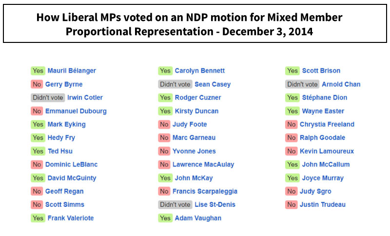 In 2014, when the Liberal caucus consisted of 34 MPs, of the 31 present for the vote, 16 voted in favour of an NDP motion for mixed member proportional representation. These included Stéphane Dion, Carolyn Bennett, Kirsty Duncan, Joyce Murray, and 12 others.