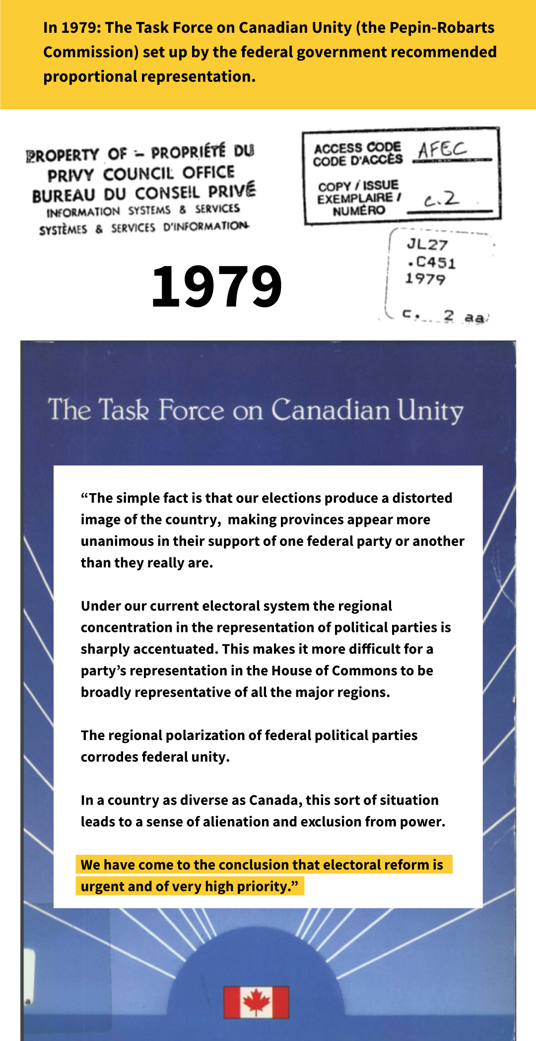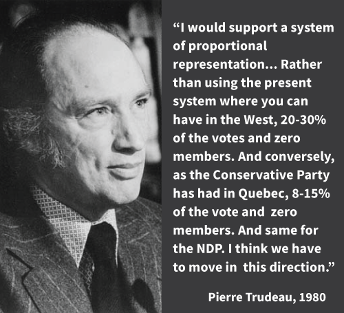 In fact, Pierre Trudeau advocated proportional representation as early as 1979, following the recommendation by the national Task Force on Canadian Unity.